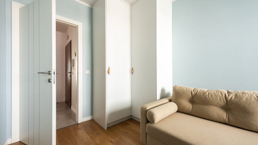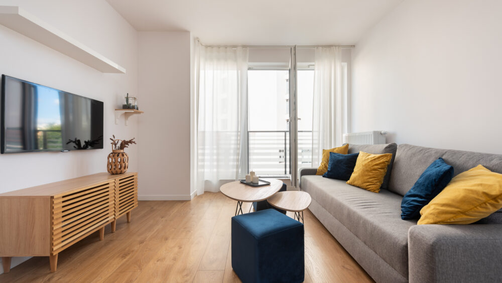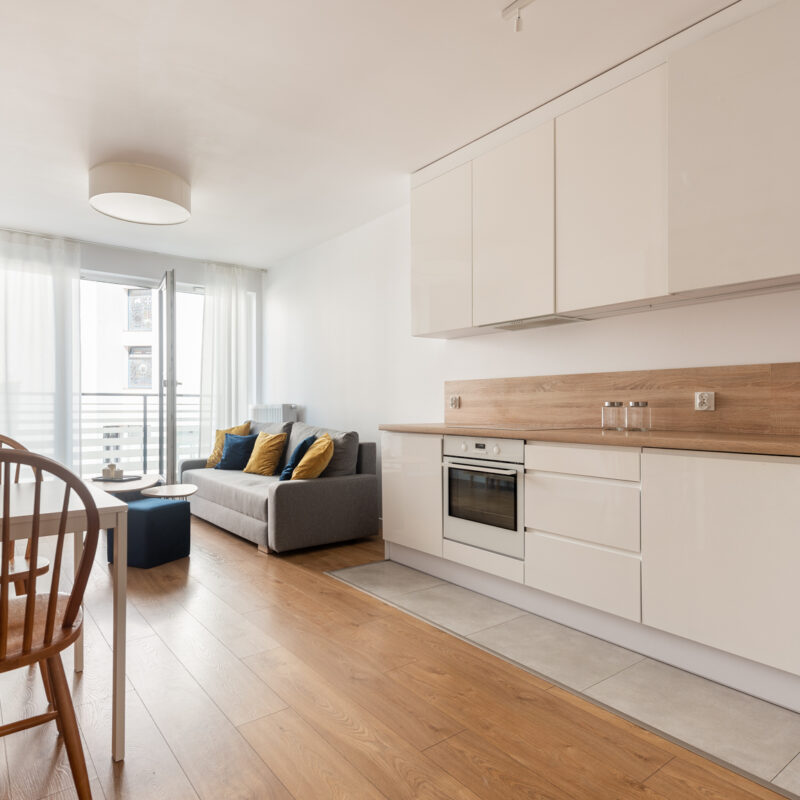 Rozkład: dwie oddzielne sypialni, salon z aneksem kuchennym, łazienka oraz balkon.