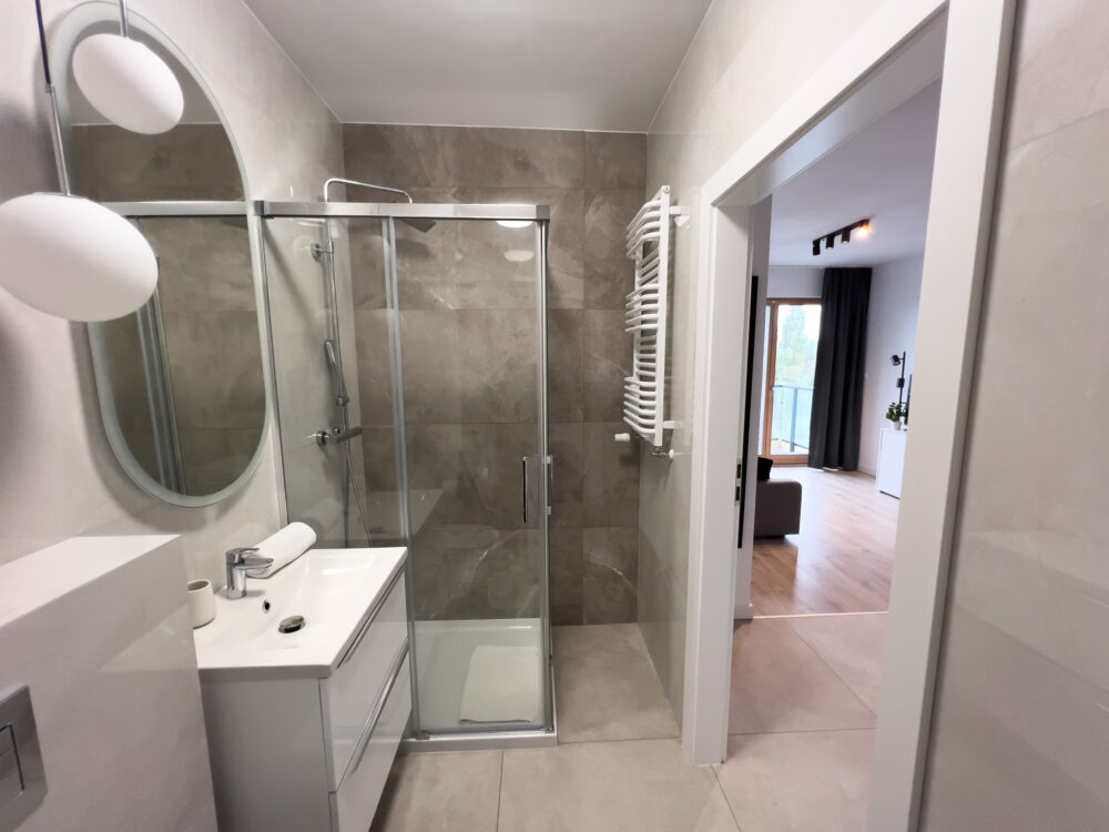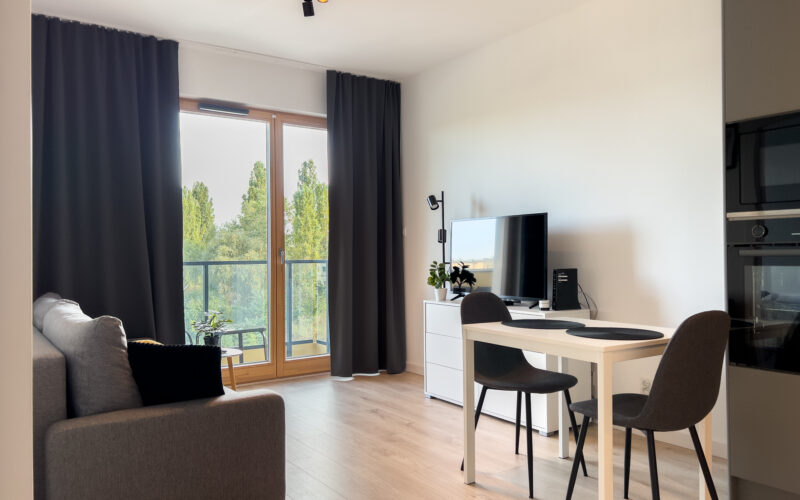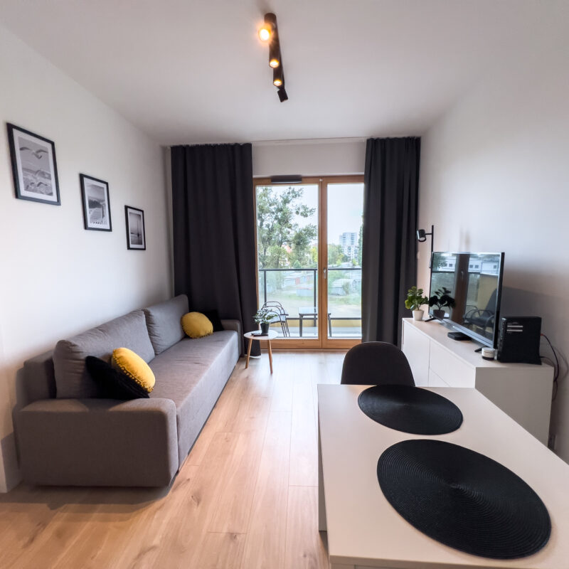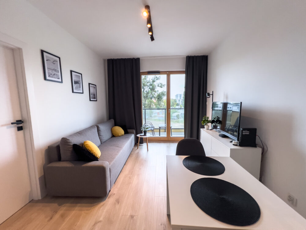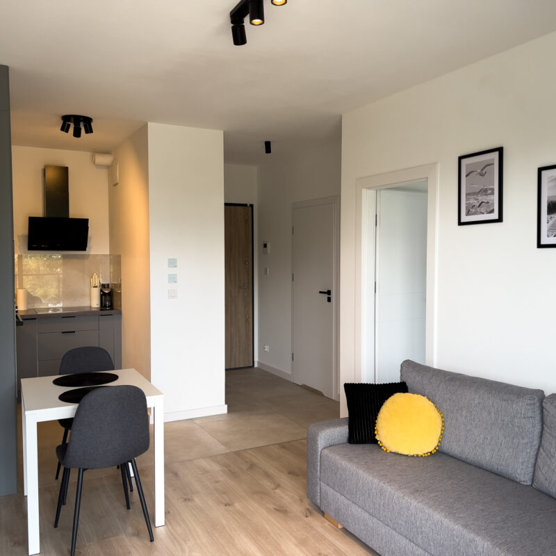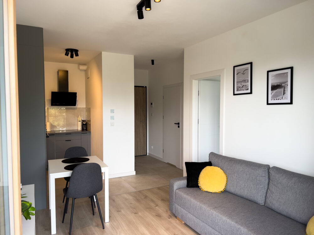 Jasny, elegancki apartament położony w dynamicznie rozwijającej się dzielnicy Letnica, niedaleko morza.