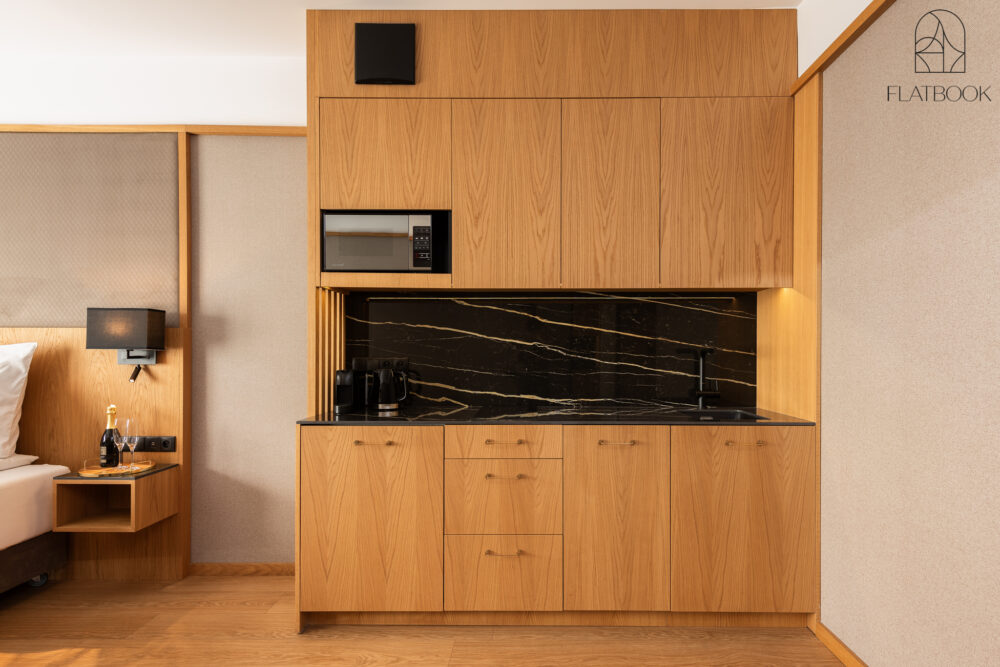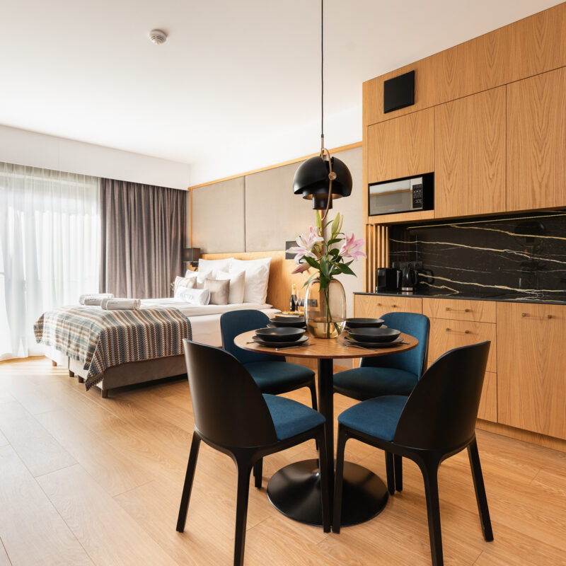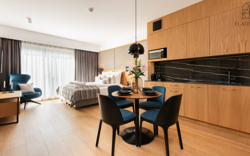Rozkład: studio z aneksem kuchennym oraz łazienka