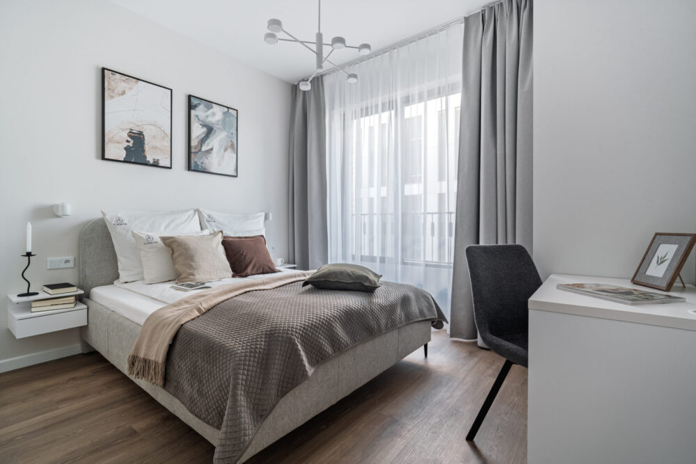 Rozkład: 2 oddzielne sypialnie, salon z aneksem kuchennym oraz 2 łazienki.