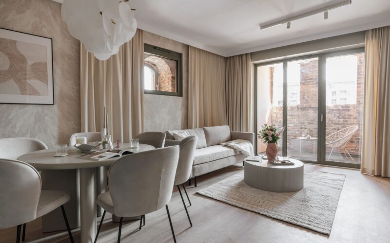 A modern, elegant apartment located in a prestigious apartment building on Granary Island. The apartment boasts elegant décor, high-standard finishes, and thoughtful furnishings, ensuring complete comfort for both short and long-term stays.